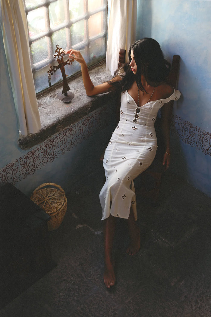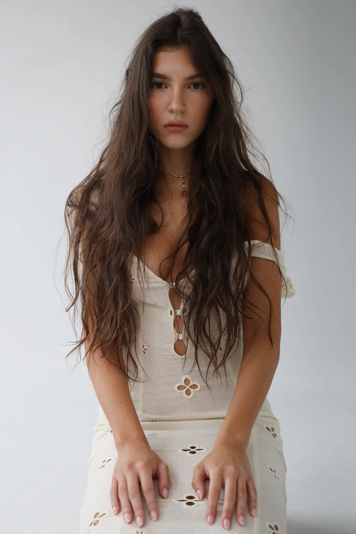 'Sasha' is perhaps our most romantic dress yet. Features a lined bust with delicate ruffle shoulder straps. The semi- sheer effect adds to the romantic feel.