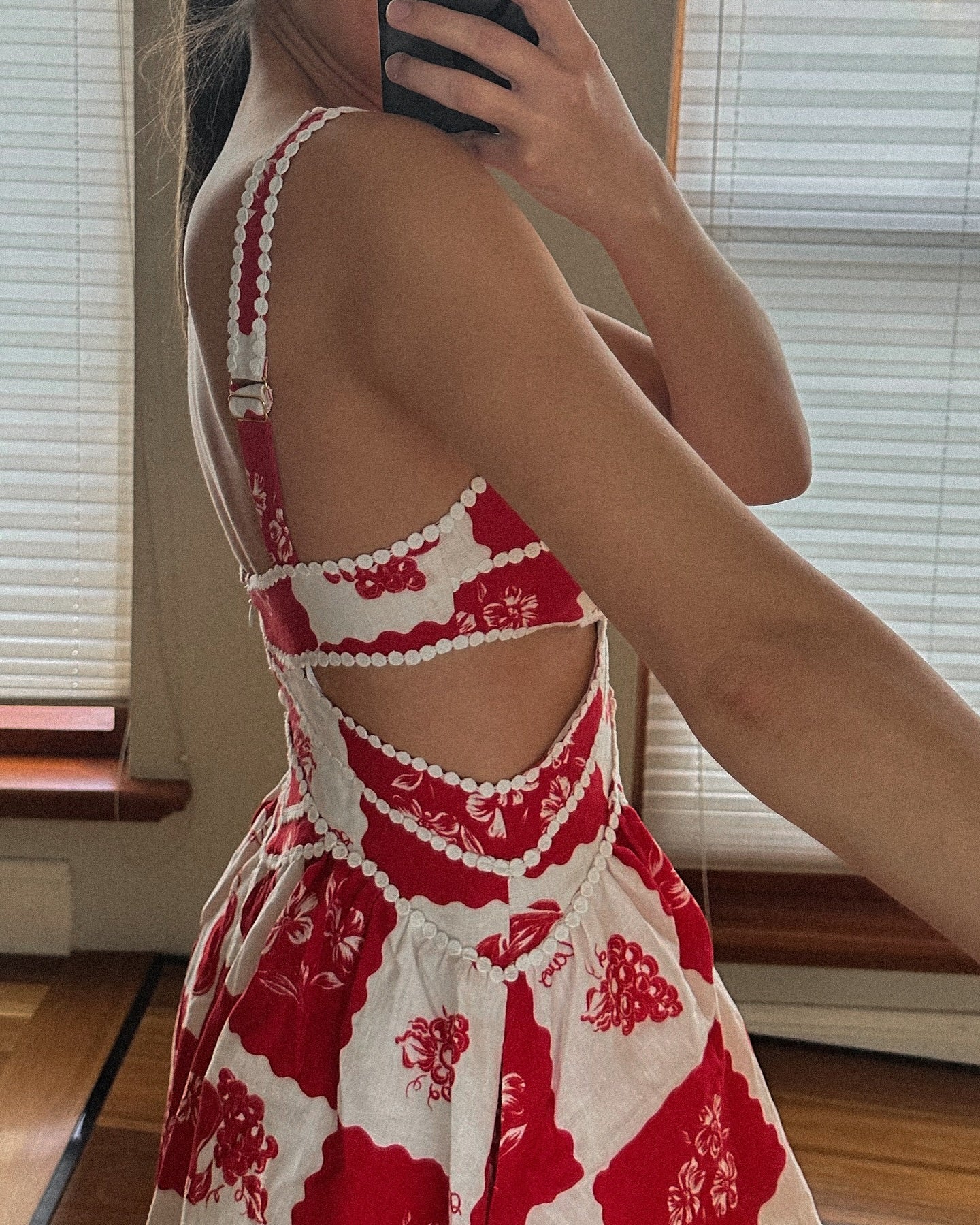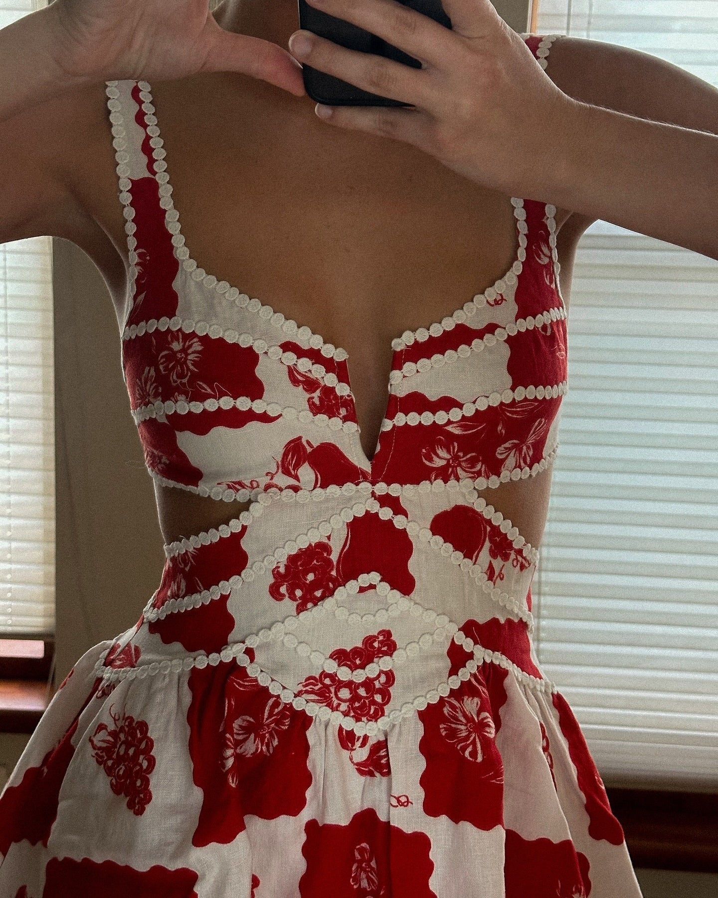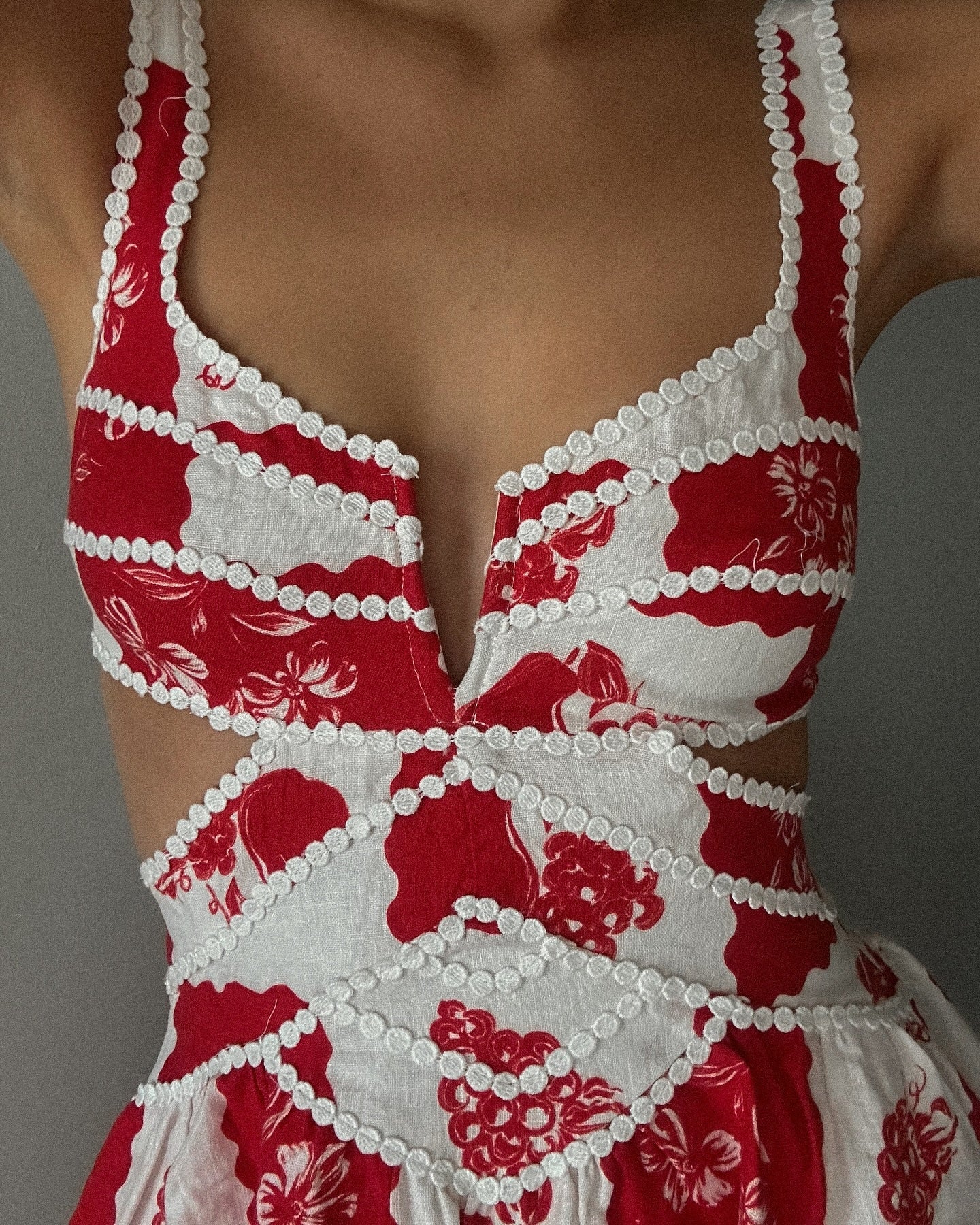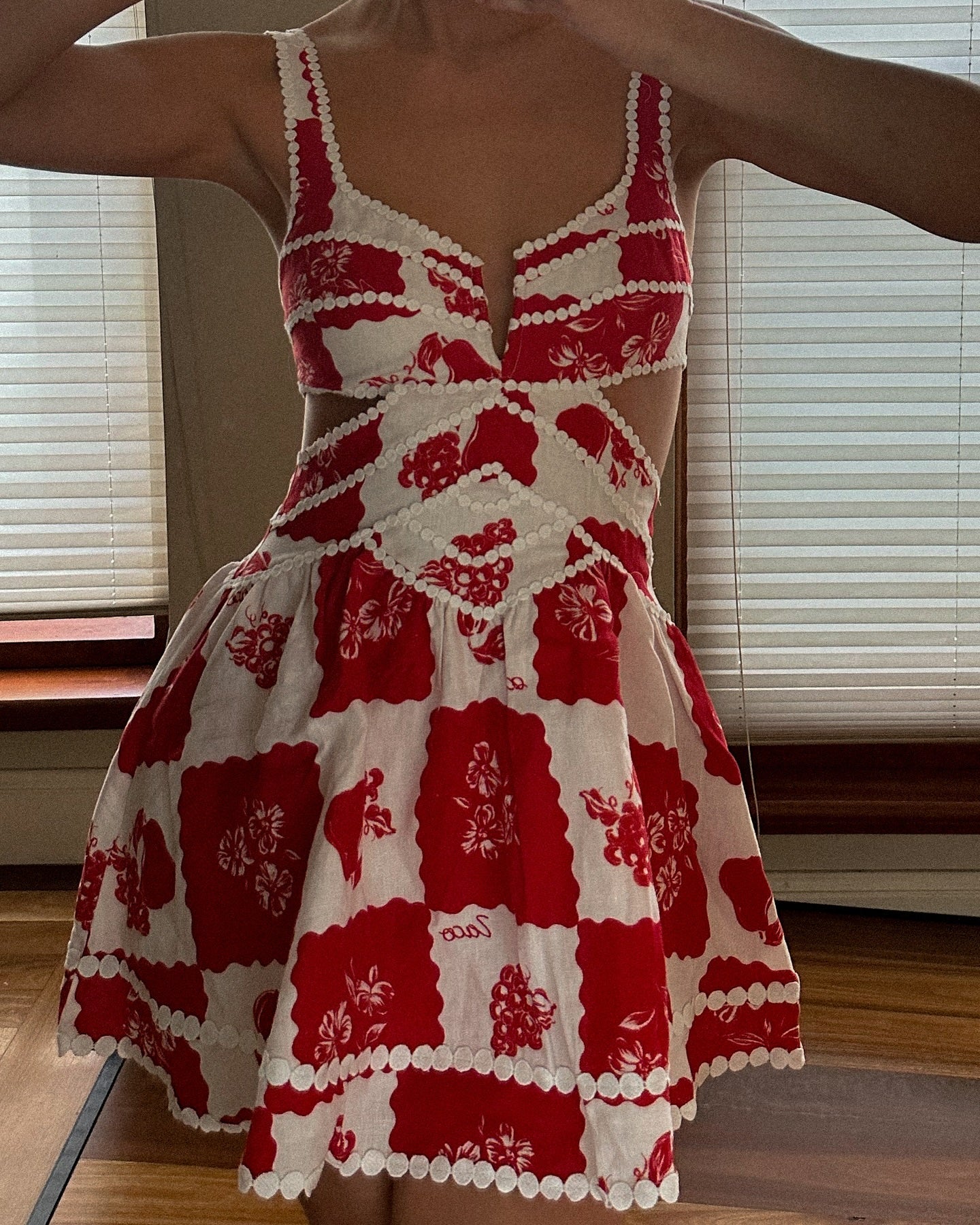 Introducing our exclusive Vivienne print, inspired by the golden sun on a European landscape. Features off shoulder puff sleeves, V at center bust, ric rac trims and a flared mini skirt